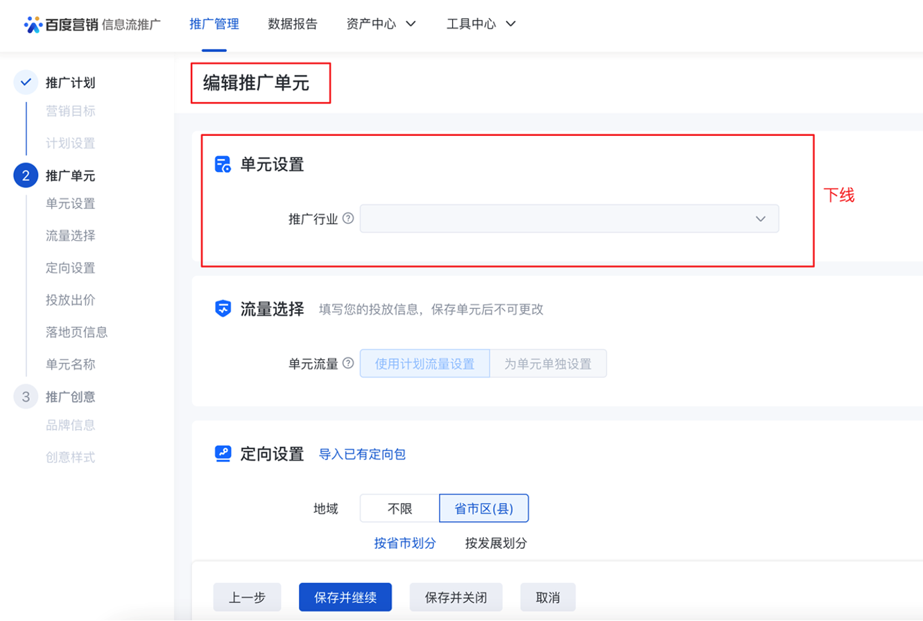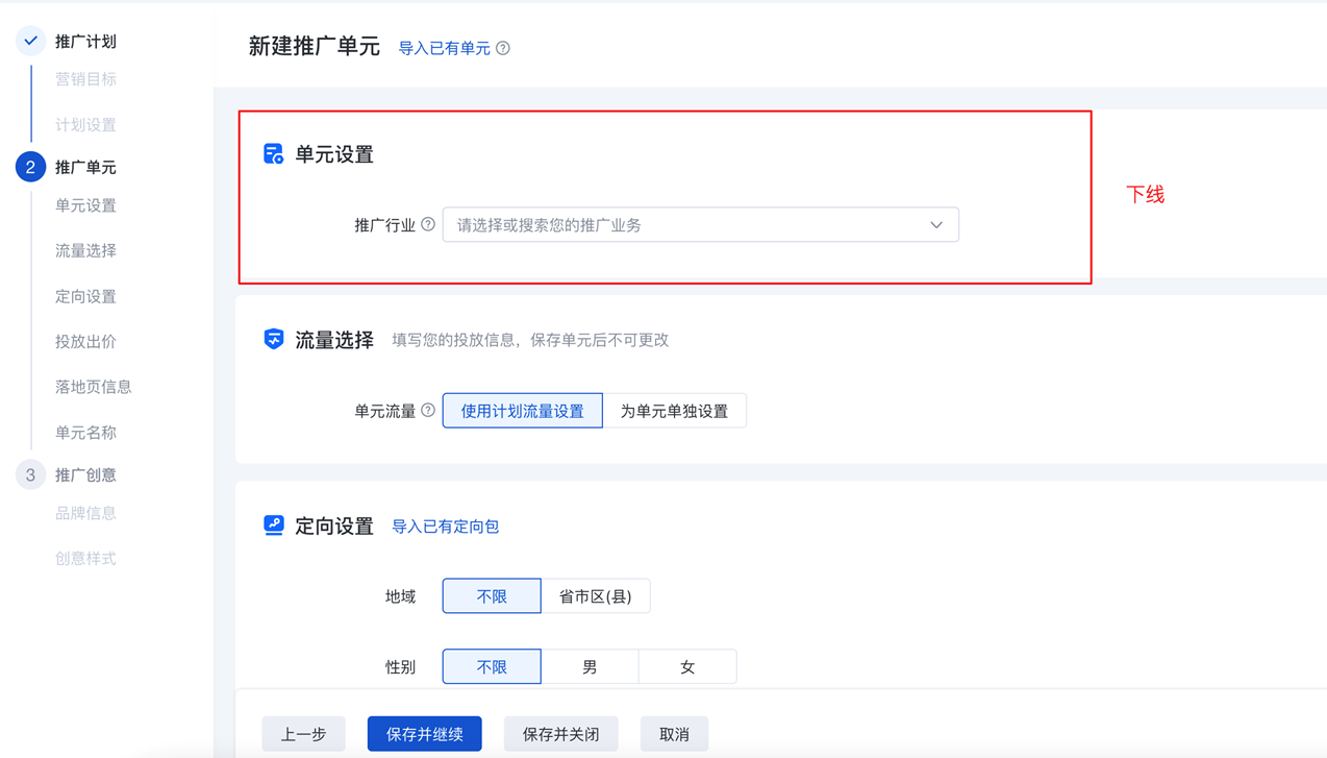 電商店鋪營銷目標計劃下的單元,下線“推廣行業(yè)”字段2.1營銷目標為電商店鋪的計劃-新建推廣單元時,不再顯示“推廣行業(yè)”的填寫: