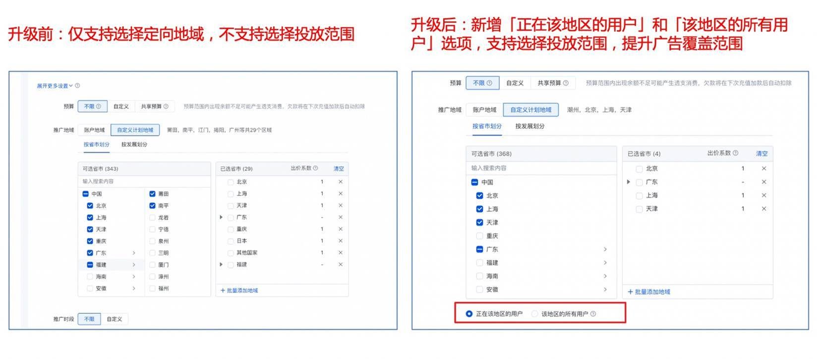本次升級后,客戶可以自行選擇投放人群范圍,同時將簡化地理位置定向表達以提升廣告效果。