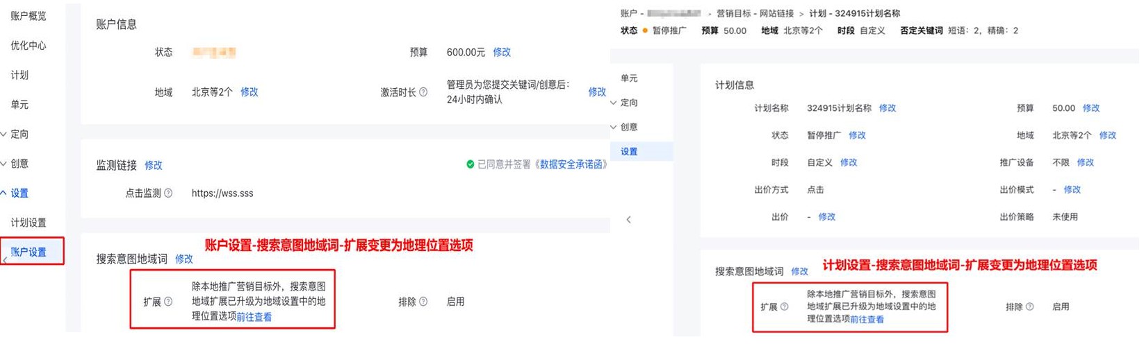 3、賬戶/計劃層級搜索意圖地域擴展開關下線,變更為地理位置選項