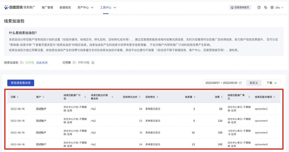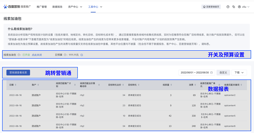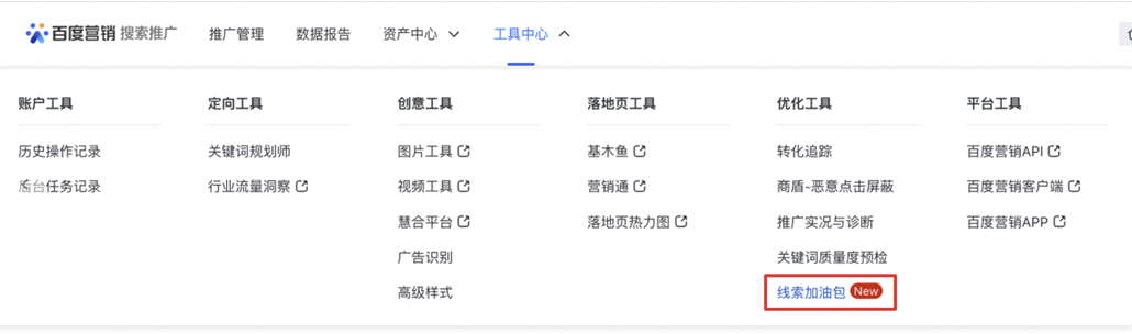 2.1入口:搜索推廣投放平臺-工具中心-優化工具-線索加油包: