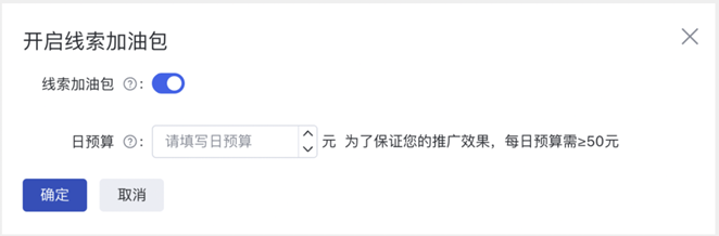 ①開關設置:開關默認為關閉狀態。開啟“線索加油包”開關,代表您愿意接收百度推送給您的符合您投放設置的高價值線索,并可進行日預算設置,建議日預算 ≥ 2個ocpc目標轉化成本。