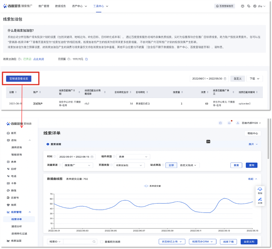 其中消費和線索量,您可以在搜索推廣投放平臺-工具中心-優化工具-線索加油包中查看(見下圖示意):