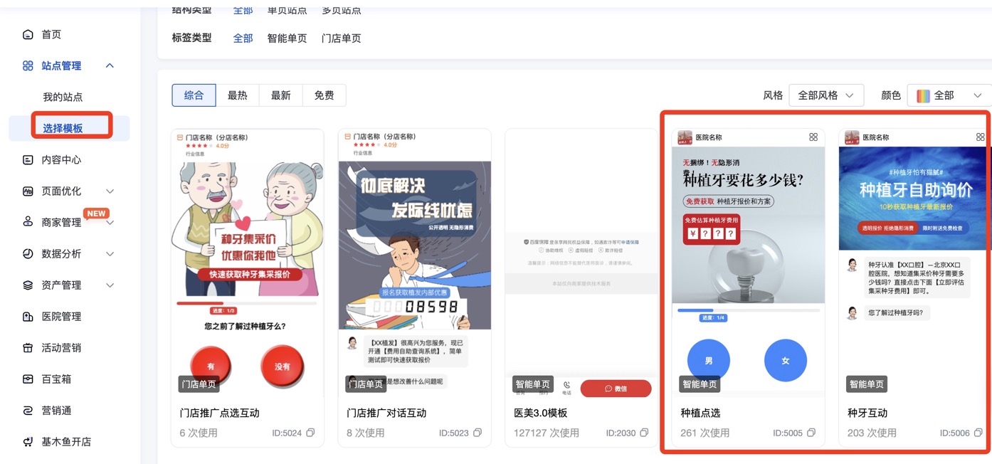 1、入口:【基木魚】→【站點管理】→【選擇模板】→「點選互動」與「對話互動」落地頁;