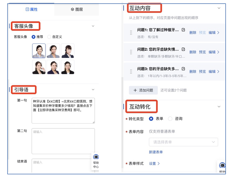 - 【對話互動】-- 支持設置「客服頭像、引導語、互動內容與互動轉化」