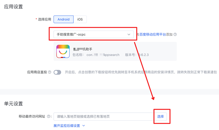 - 若計劃層級「商品目錄」選項選擇「不啟用」,即進入常規(guī)應用推廣計劃,可在單元層級「移動最終訪問網(wǎng)址」設置落地頁信息;