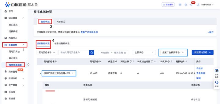 程序化落地頁組入口: 頁面優(yōu)化-程序化落地頁-智能優(yōu)選-搜索智能優(yōu)選