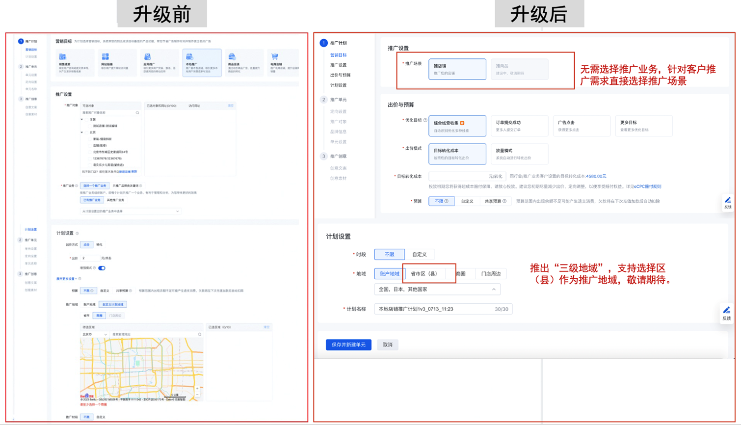 - 深入業務場景:以推店鋪/推商品為核心,將店鋪選擇下移至單元層級,以一單元設置一店鋪的模式;升級地域設置支持可選"三級地域"區/縣標簽,更好地契合本地客戶的業務模式。