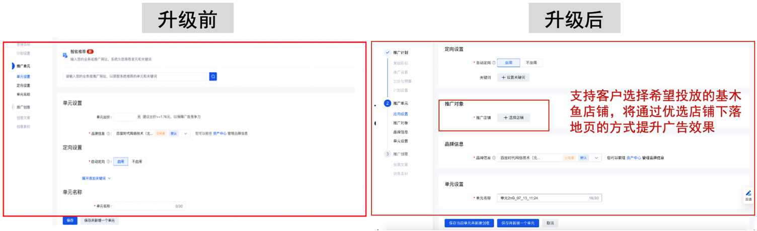 - 推廣店鋪由原計劃層級下移至單元層級,解決多業務店鋪投放繁瑣的問題,并深度打通單元層級下店鋪-定向-創意和落地頁的鏈路,實現更優質的投放效果。