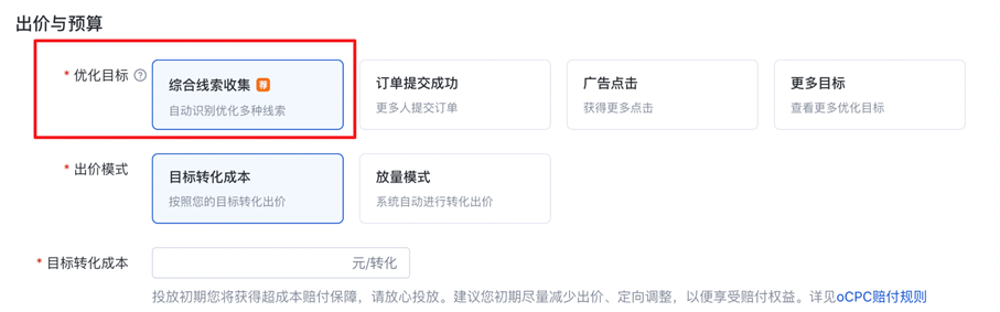 - 優化目標:推薦優化目標選擇“綜合線索收集” (目前包括留線索、表單提交、電話撥通)便于自動識別優化多種線索,也可根據需求快捷選擇訂單提交成功、廣告點擊等兩類主要優化目標,或 "更多目標"自定義設置優化目標。