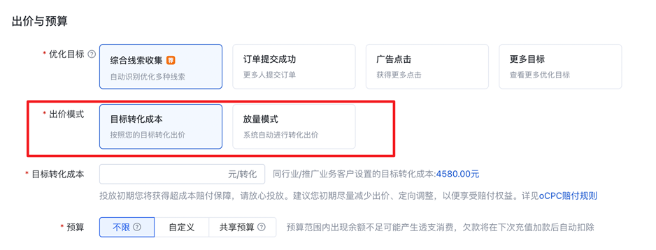 - 出價模式:您可以快捷選擇"目標轉化成本"及"放量模式"兩大類方式,快速完成出價設定,操作更便捷。
