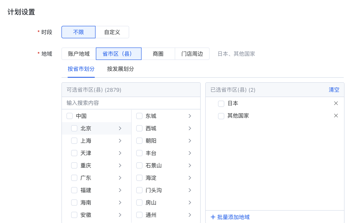在計劃設置中,地域屬性支持選擇"三級地域"標簽,精確到區/縣,方便本地化業務投放區域更精準。(預計8月上線,敬請期待)