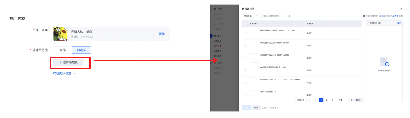 2、推廣店鋪確認后,您可選擇落地頁范圍,通過程序化落地頁將多個落地頁進行相關性、CVR優選投放。方便客戶專注經營內容資產,用程序化能力實現內容的投放優化,提升投放效果。