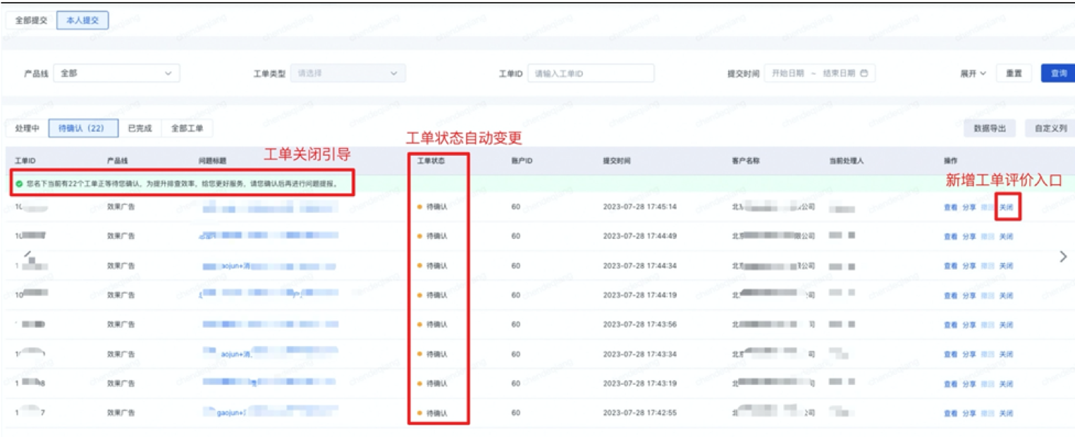 增加工單自動關(guān)閉規(guī)則:狀態(tài)為【待確認】的工單,在提交側(cè)和處理側(cè)在30天內(nèi)均無操作的情況下,系統(tǒng)會自動將工單狀態(tài)變更為【已完成】,默認評價內(nèi)容為“-”,工單關(guān)閉后不再有追問功能。注意存量工單將于8月10日生效此規(guī)則,增量工單將于8月11日生效此規(guī)則。