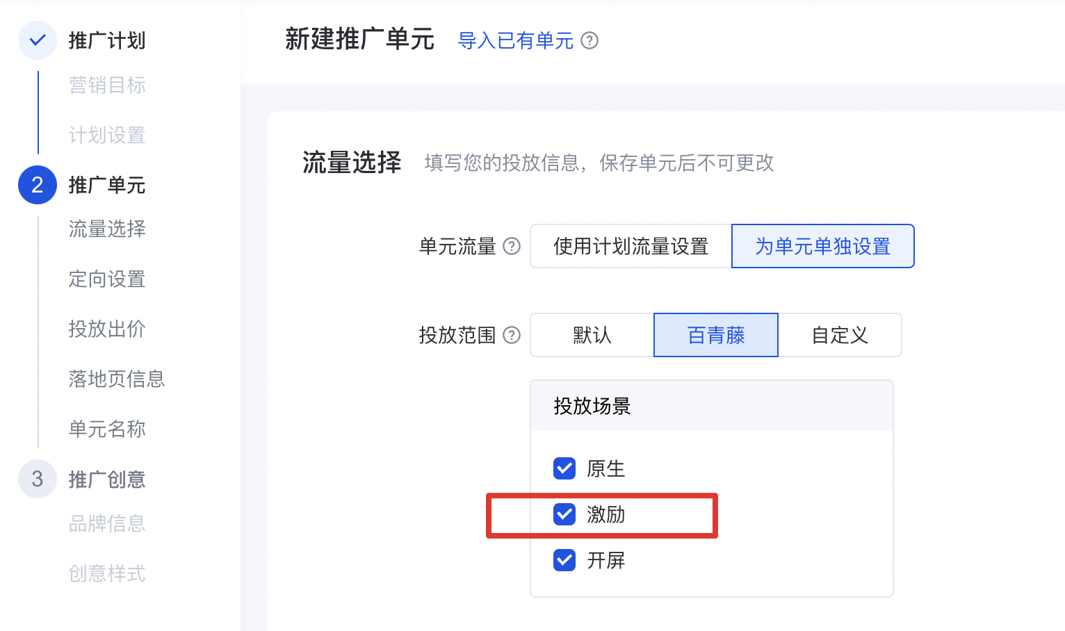 流量選擇:當推廣計劃的營銷目標為「應用推廣」、單元流量選擇「為單元單獨設置」、投放范圍選擇「百青藤」時,支持選擇「投放場景」:原生、激勵、開屏。(當流量選擇「為單元單獨設置」時,單元層級流量范圍須為計劃層級流量范圍的子集;即若計劃流量未選擇激勵,則單元層級流量設置也不支持選擇。)