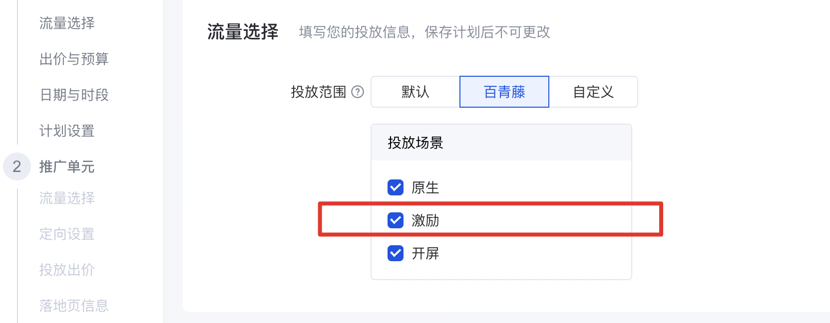 - 計劃/單元層級投放范圍:新增百青藤激勵投放場景