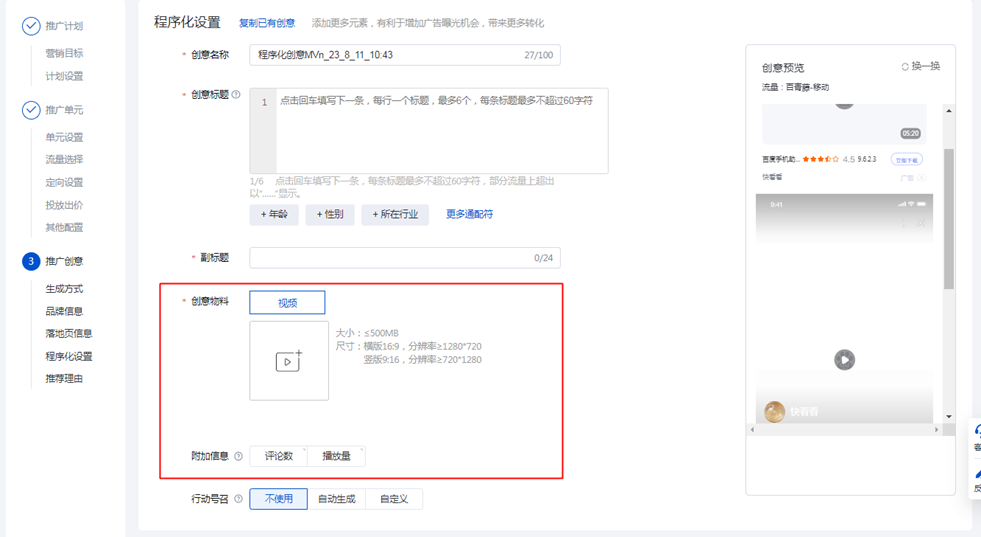 當推廣計劃的營銷目標為「應用推廣」,流量投放范圍包含「百青藤-原生」或「百青藤-激勵」時,支持創建程序化創意。