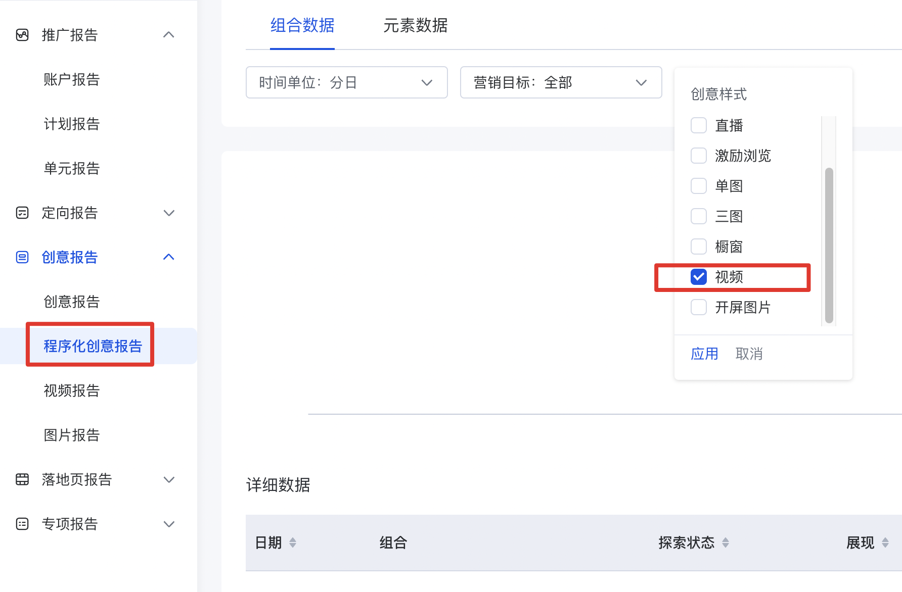程序化創意報告-組合數據-創意樣式-視頻樣式,查看激勵視頻數據