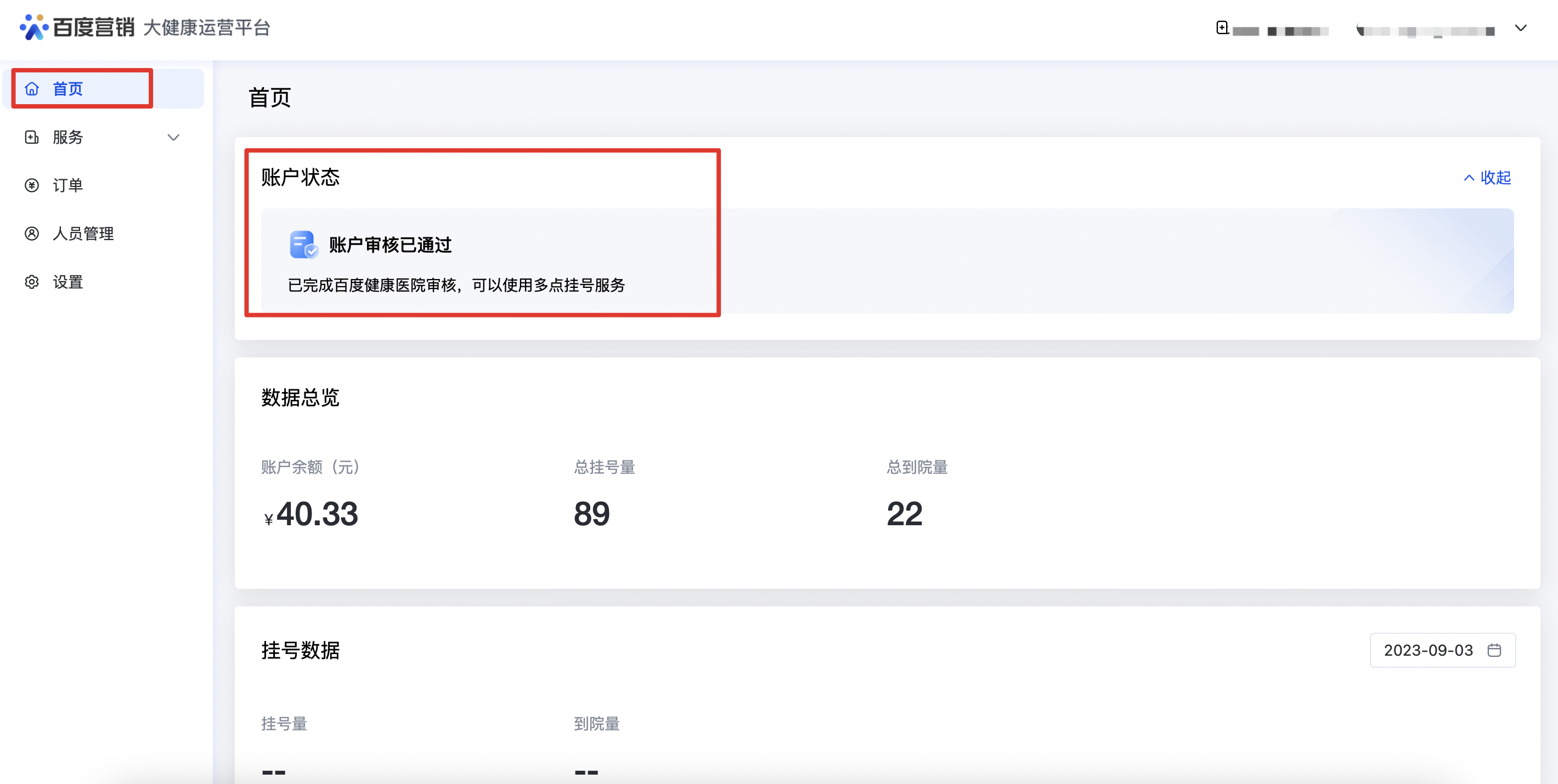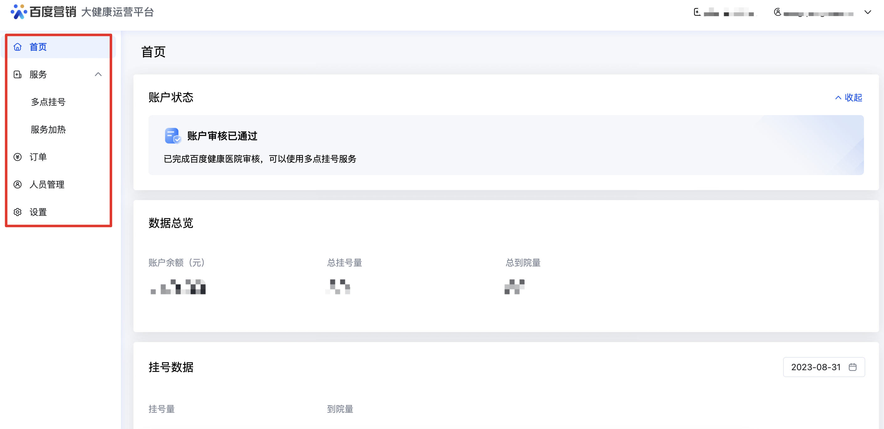 ①首頁:披露賬戶狀態、數據總覽、掛號數據等