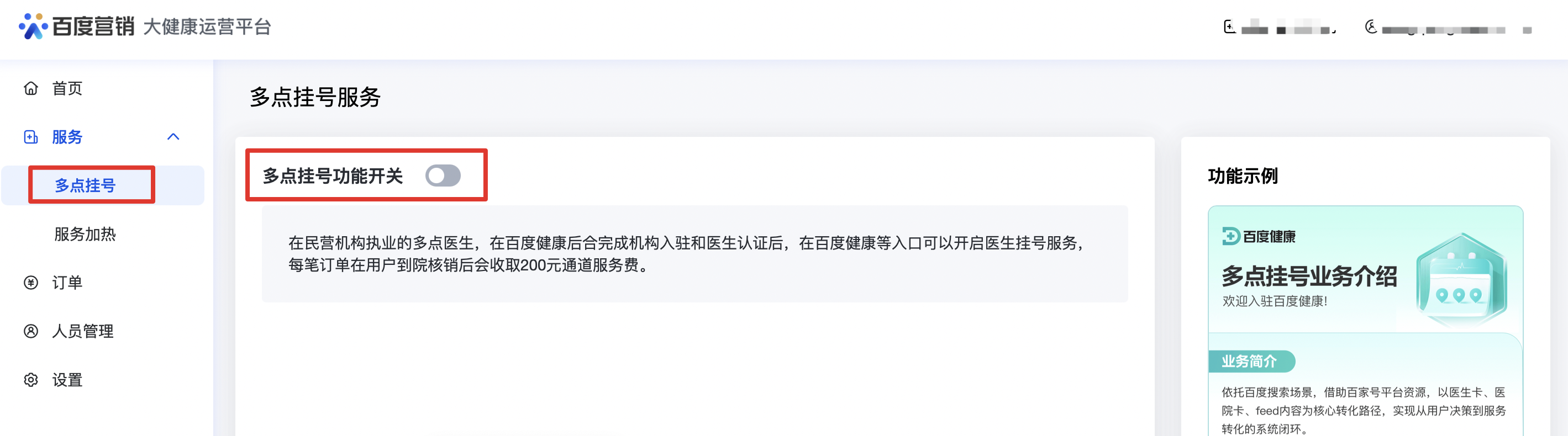 多點掛號服務開關,默認關閉,需客戶手動開啟;開啟服務會判斷①機構審核與醫生審核狀態 ②資金池是否欠費;如果資金池欠費,則無法開啟多點掛號投放,且掛號服務默認關閉;開啟后,引導客戶簽署線上服務協議;