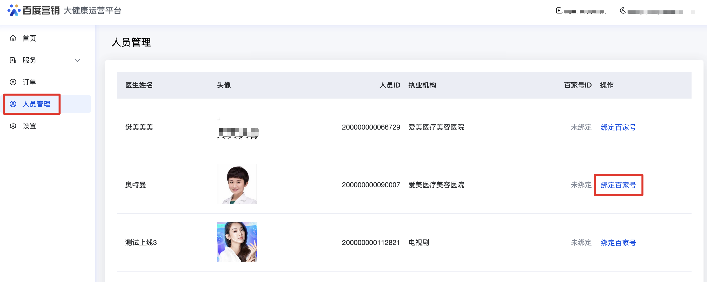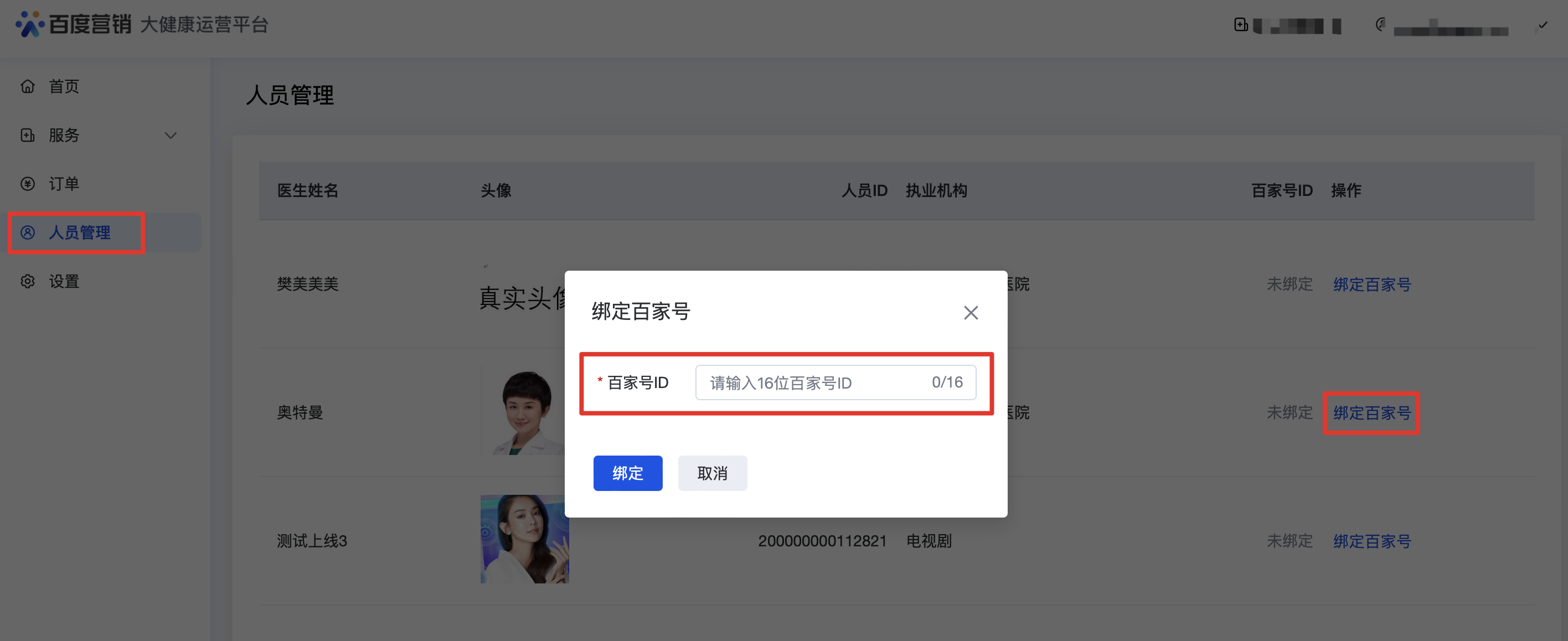 ①點擊左側“人員管理”,頁面展示該賬戶下關聯的基木魚醫生,選擇需要綁定的醫生,點擊“綁定百家號”;