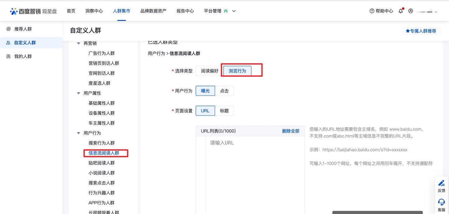 1. 功能入口:您可以在「自定義人群-信息流閱讀人群」中選擇「瀏覽行為」進行圈人。