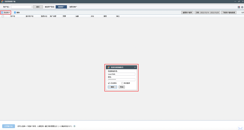 第一步:百度營銷客戶端(推廣助手)支持CRM賬號登錄,并進行物料操作、查看等,打開百度營銷客戶端,點擊“添加賬戶”,輸入CRM賬戶和密碼 ,點擊“確定”后登錄。