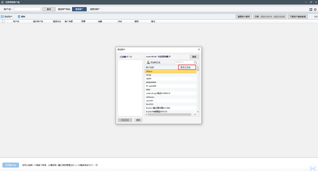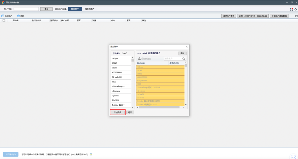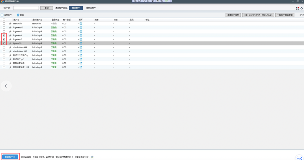 第二步:添加完成后,在客戶端選擇賬戶頁面,可查看新添加的子賬戶(如下圖),勾選需要的子賬戶后,點擊“打開賬戶“后進行后續物料操作、查看等。具體編輯操作功能請到營銷中心查看產品基礎手冊:https://yingxiao.baidu.com/course/outside/detail?from=yingxiaoSearch&detailId=4804