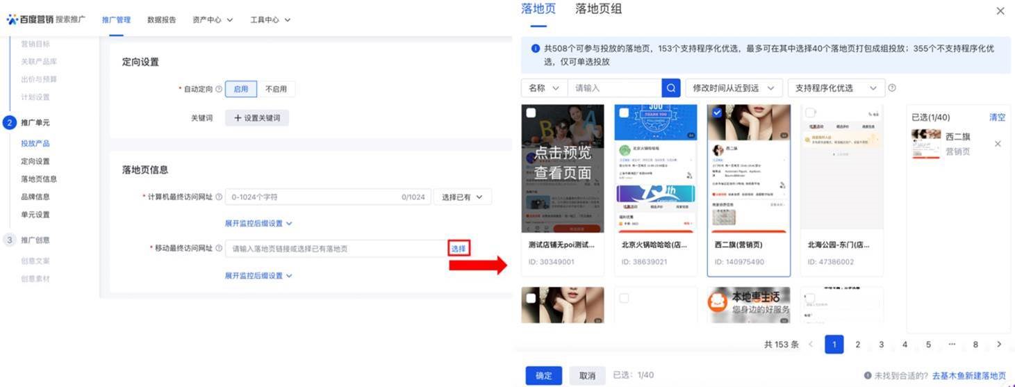 基于上述背景,為幫助廣告主和優化師提高銷售線索拉新獲客場景下的投放效率,百度搜索推廣本次升級,支持在銷售線索營銷目標計劃中,在單元/創意/關鍵詞直接設置基木魚程序化落地頁組(無需先去基木魚后臺創建程序化落地頁組后投放程序化落地頁組的URL),直接選取多個審核通過的基木魚落地頁打包為程序化落地頁組進行投放,降低使用基木魚程序化落地頁組的操作門檻,充分釋放程序化落地頁組的效果優勢。