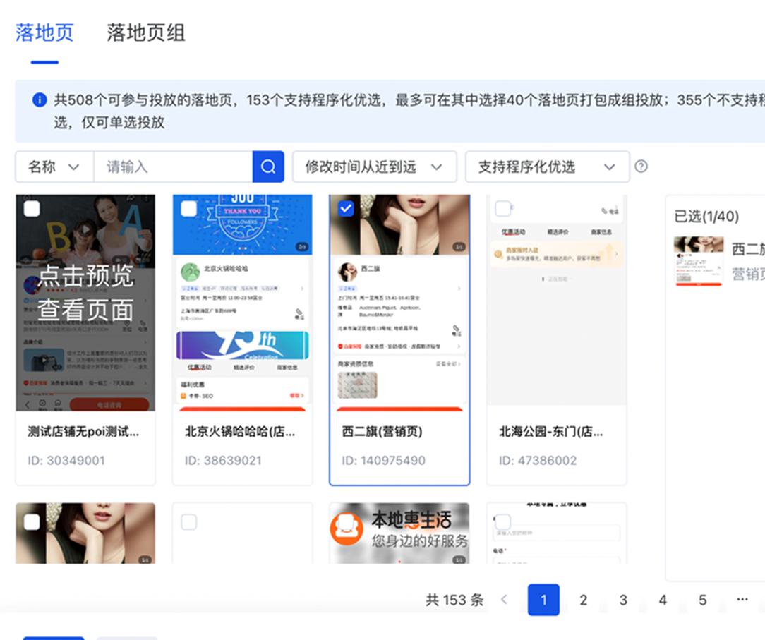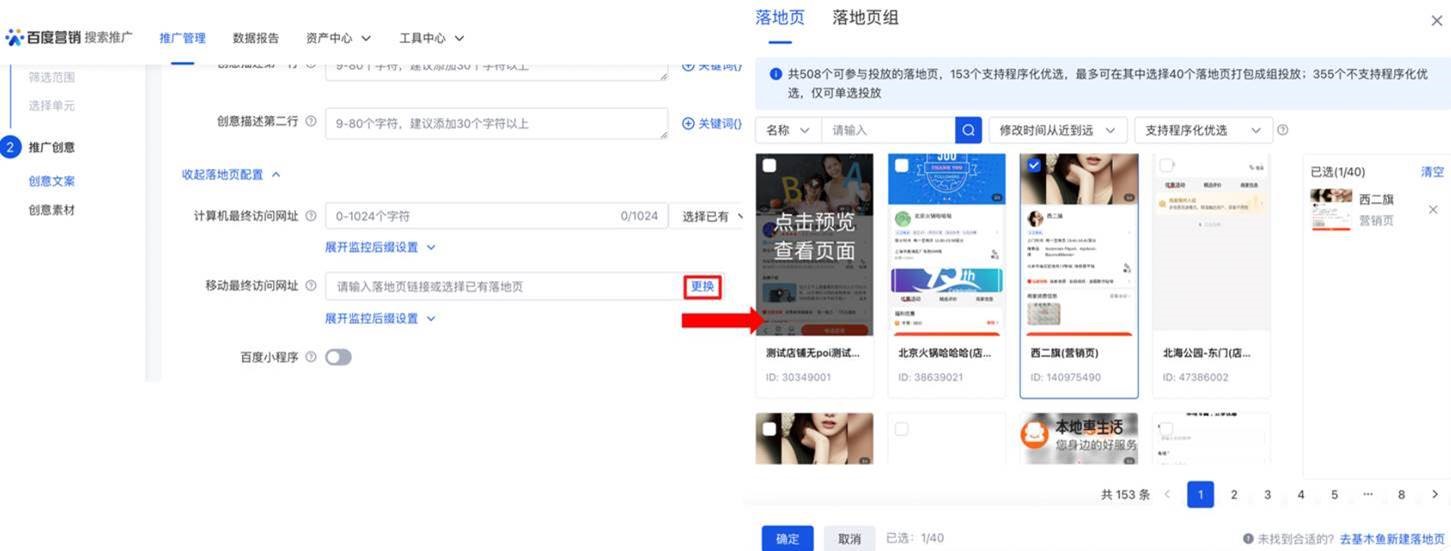 - 在搜索廣告平臺勾選的營銷頁會展示在「營銷頁選擇」模塊內,并支持新增選取或刪減