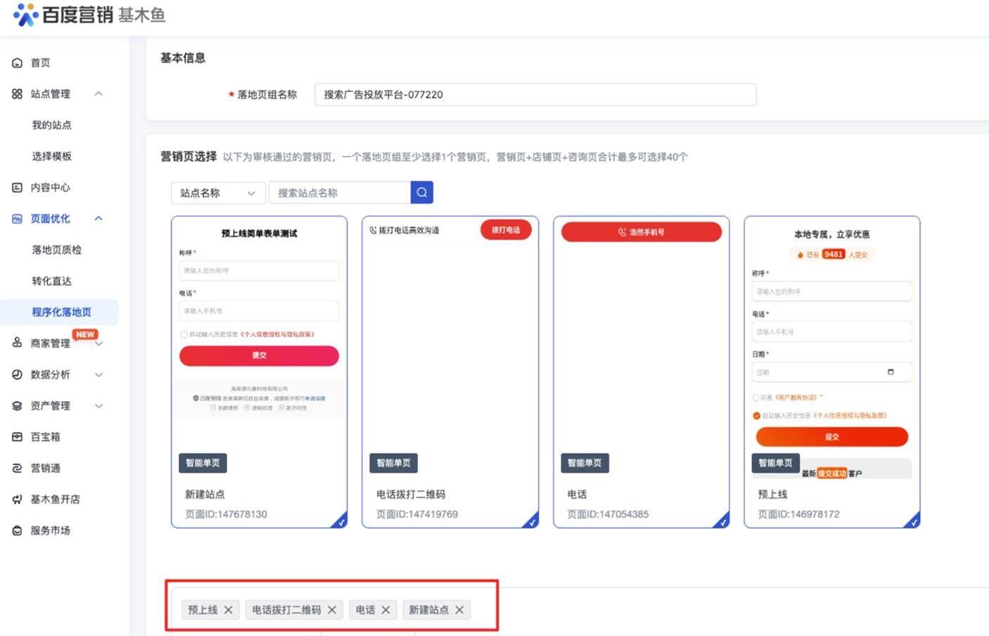 搜索廣告投放平臺多選營銷頁自動創建的程序化組,會展示在基木魚平臺程序化列表中,支持編輯修改