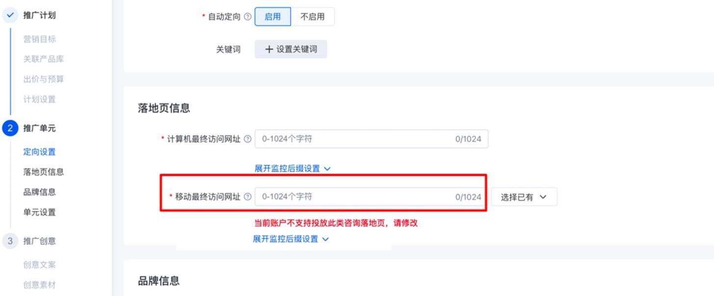 當賬戶屬于“教育培訓”一級行業下的所有二級行業 或“商務服務-法律服務”二級行業 或 醫療和醫美強制托管名單內時,客戶在搜索廣告網站鏈接以及銷售線索營銷目標下的移動最終訪問網址中,可填寫ada咨詢頁進行投放(URL為ada.baidu.com/xxxx形式),其他不屬于上述行業的賬戶,不支持填寫,系統會提示:“當前賬戶不支持投放此類咨詢落地頁,請修改”。(其他行業客戶若要投放ada咨詢頁,可用線上已有的程序化落地頁組功能,將ada咨詢頁與營銷頁打包為程序化落地頁組后進行投放,系統會自動從組里優選適合的落地頁進行展現)