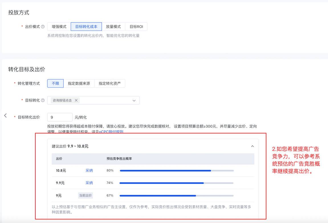 1.選擇目標轉化后,系統將自動根據廣告競爭勝出概率預估,從廣告效益最佳的角度為您推薦出價,并且在出價設置中默認填入推薦出價。