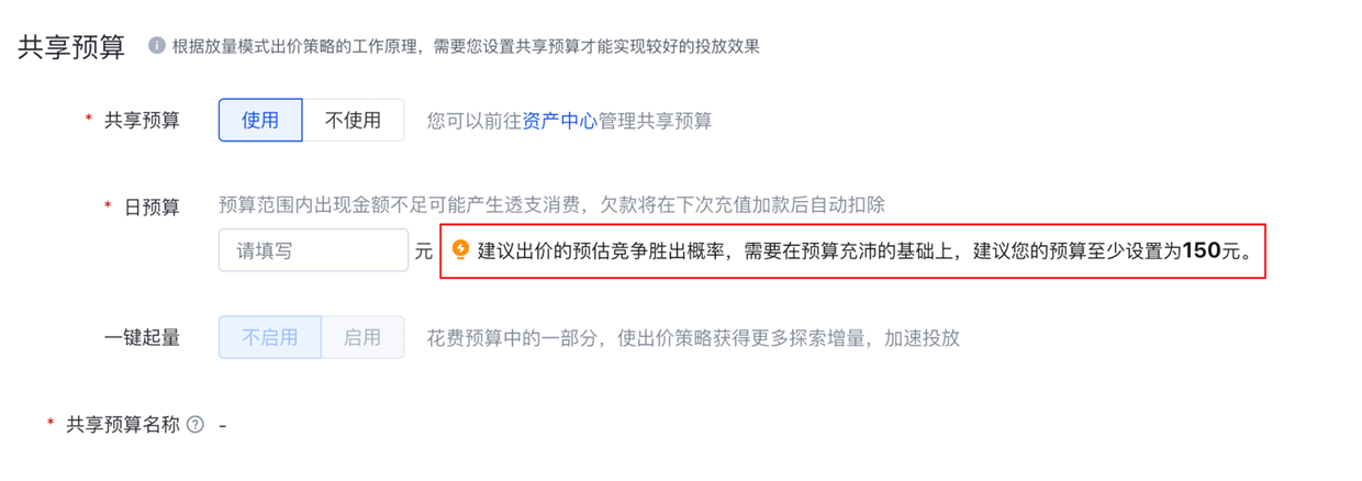 3.當前出價下的廣告競爭力同時也會受到預算設置的影響,預算不充沛也會給廣告競爭力帶來負面影響,因此建議您將預算設置為不限,或者根據系統的提示,確保預算充足。