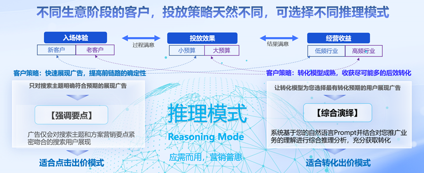 智能體會基于對您過去投放習慣和行業特色的理解,為您默認選擇推理模式。 也就是說,當在輕舸新建方案時,選擇優化目標后,系統將綜合您的過往投放習慣、您所在行業的普遍特征,及您當前的營銷訴求,為方案默認選擇一種契合的推理模式。(通過“搜索推廣--一鍵試投輕舸”工具創建的方案,及本功能上線前已創建的方案,均會被賦予推理模式的設置)