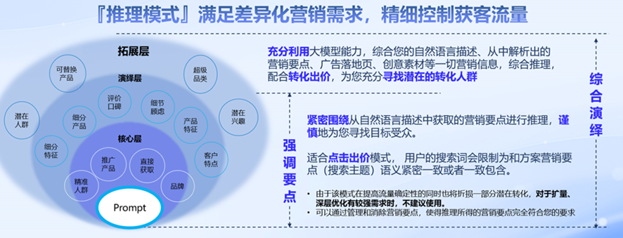 A2:“強調要點”推理模式的工作原理是緊密圍繞從自然語言描述中獲取的營銷要點進行推理,謹慎地為您尋找目標受眾。因此,在提高流量確定性的同時也將折損一部分潛在轉化。如果您對擴量、深層優化有較強需求,建議您將推理模式切換為“綜合演繹”,以充分利用大模型能力,積極擴量,更大化探索目標受眾。另外,您可以參考Prompt生成廣告 實戰指南 進行擴量優化。