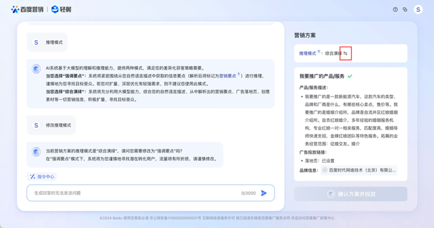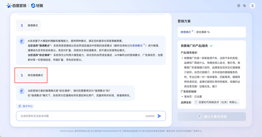輕舸鼓勵“放開說”,通過自然語言表達推廣業務和目標受眾,為滿足差異化的獲客策略需要,本次推出“推理模式”功能,您可以根據營銷需要為投放方案選擇如下兩種推理模式——