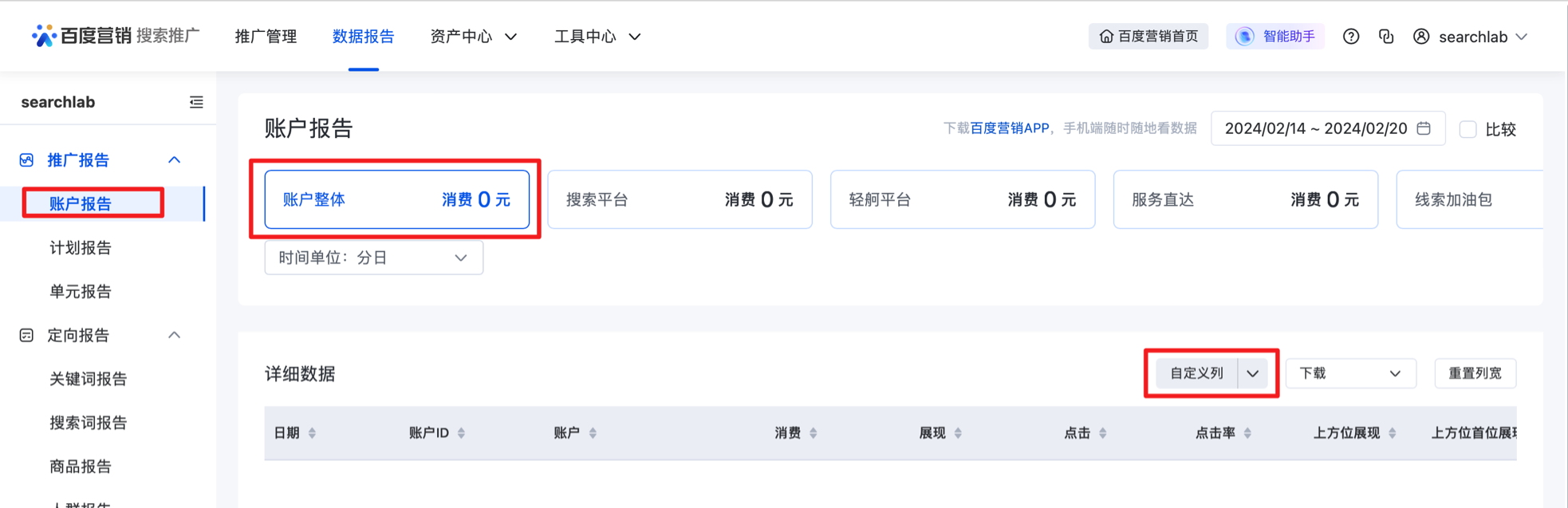 登錄搜索廣告投放平臺,進入數據報告—>賬戶報告—>賬戶整體,在自定義列中選擇所需查看的轉化指標即可。