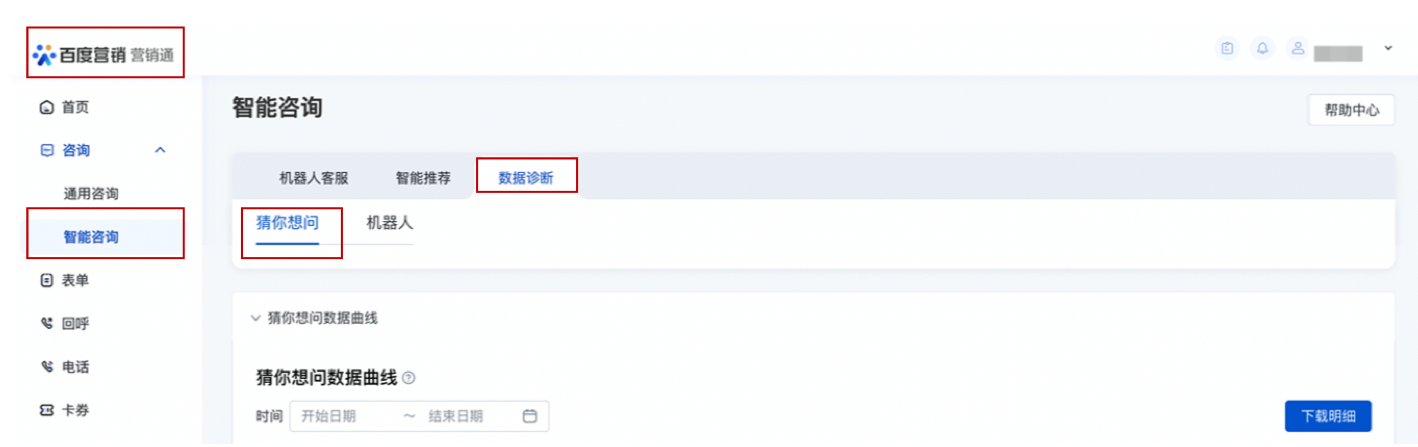入口:營銷通-咨詢-智能咨詢-數據診斷-猜你想問