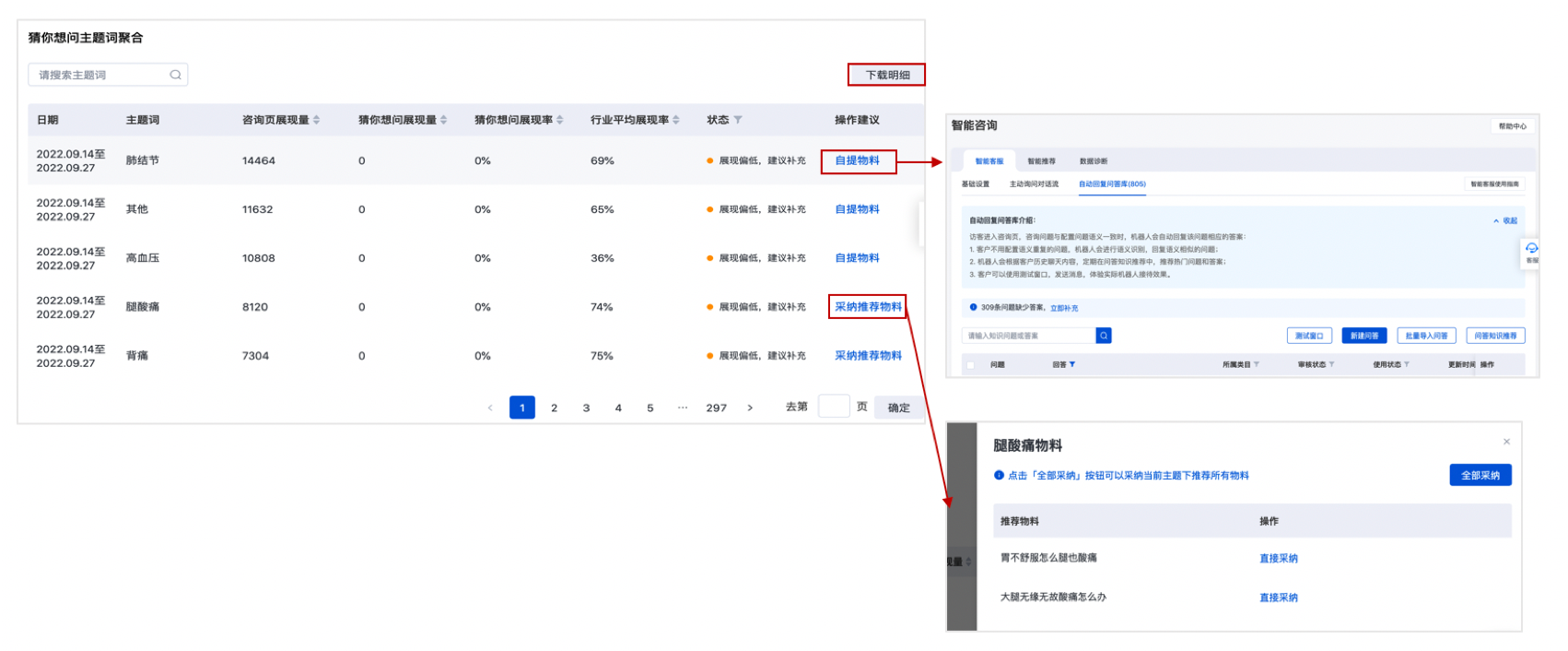 * “采納推薦物料”: 當展現率低于行業均值,策略挖掘該詞的常見問題并進行推薦,客戶可以自行采納;