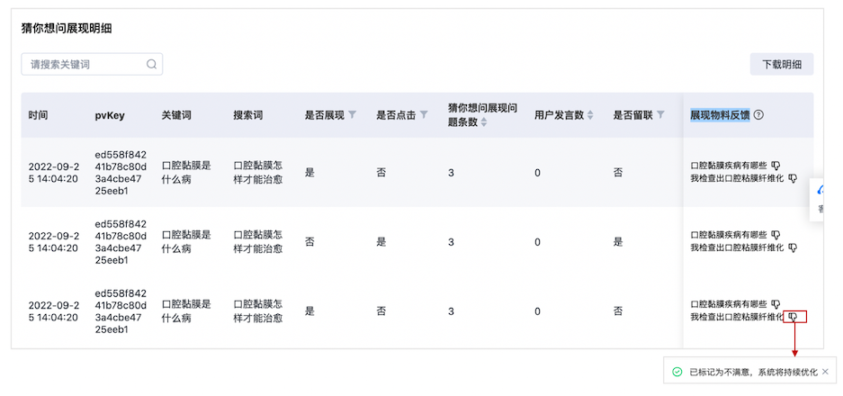 1)按疾病詞(含機構詞)維度進行聚合,展現所選時間段內的咨詢頁展現量、猜你想問樣式的展現次數、猜你想問樣式的展現率等數據,幫助客戶輔助客戶有針對性的提升展現率;