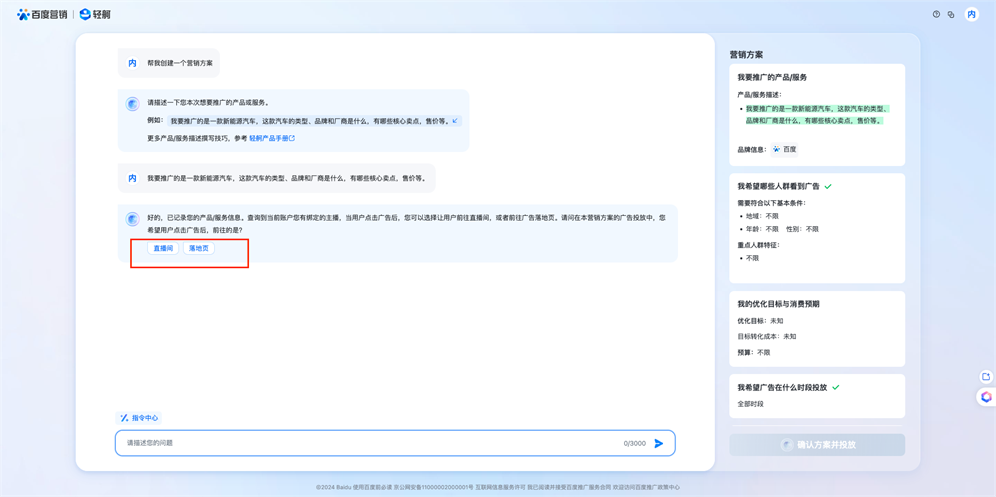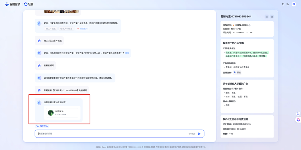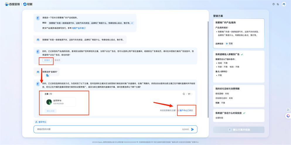 A:目前創建方案場景下,系統會自動查詢當前賬戶在賬戶中心里是否有綁定的主播,若能查詢到主播且該主播有設置直播間(需同時滿足這兩個條件),系統將會自動命中在落地頁設置環節支持選擇主播投放;另一方面,目前直播間僅支持用于推廣信息流廣告,請確保您的輕舸賬戶是信息流推廣賬戶。