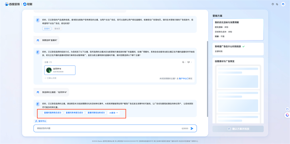 - 選擇主播后,您可根據推廣訴求,設置本次營銷方案直播間相關的轉化目標;