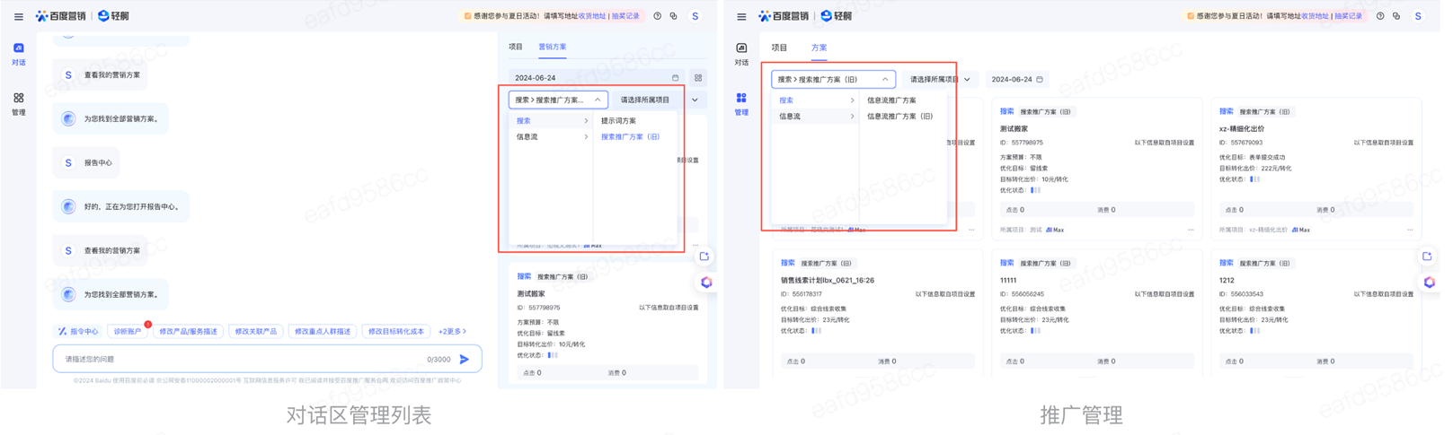 支持您在對話區(qū)右側(cè)的【方案管理列表】和【推廣管理】中分廣告渠道查看并管理您的方案