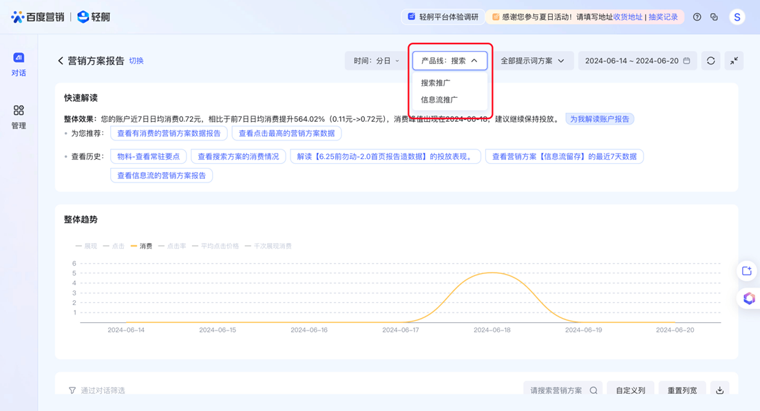 本次升級后,您可以在輕舸上同時新建、管理 搜索/信息流營銷方案,同時也支持查看搜索/信息流數(shù)據(jù)報告,具體升級點如下