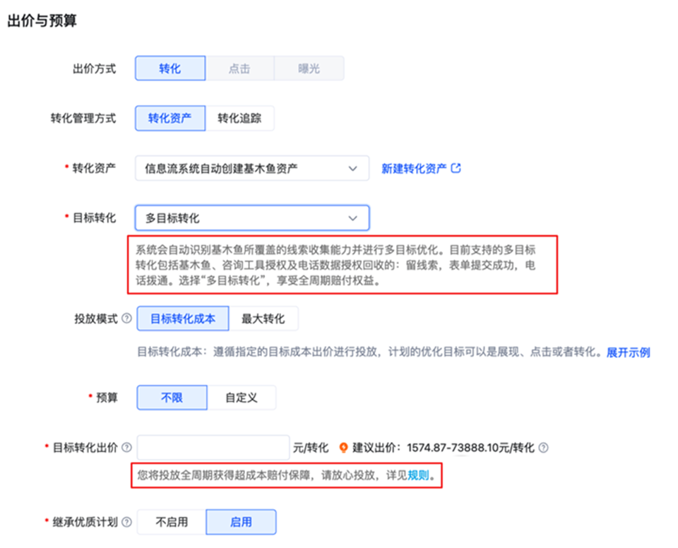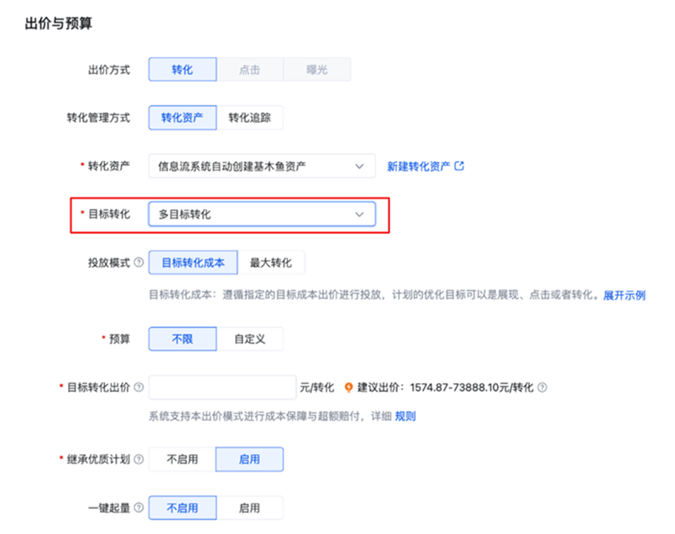 在信息流推廣投放中,如果客戶的事件管理中包含基木魚資產(chǎn)或者轉(zhuǎn)化追蹤中包含“表單提交成功”、“電話撥通”、“留線索”轉(zhuǎn)化目標(biāo),當(dāng)選擇銷售線索營(yíng)銷目標(biāo)時(shí),項(xiàng)目層級(jí)會(huì)默認(rèn)選擇「多目標(biāo)轉(zhuǎn)化」目標(biāo)轉(zhuǎn)化,計(jì)劃層級(jí)會(huì)默認(rèn)為客戶選擇一個(gè)符合條件的轉(zhuǎn)化資產(chǎn)或轉(zhuǎn)化追蹤,且默認(rèn)勾選「多目標(biāo)轉(zhuǎn)化」作為轉(zhuǎn)化目標(biāo),使用『多目標(biāo)轉(zhuǎn)化』后,系統(tǒng)將自動(dòng)識(shí)別基木魚落地頁(yè)當(dāng)中的“表單提交成功”、“電話撥通”或“咨詢留線索” 并進(jìn)行多目標(biāo)優(yōu)化,提升整體轉(zhuǎn)化數(shù)量。