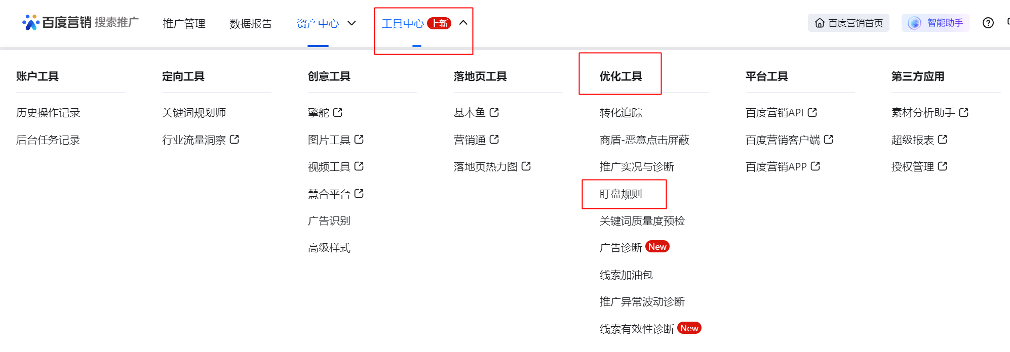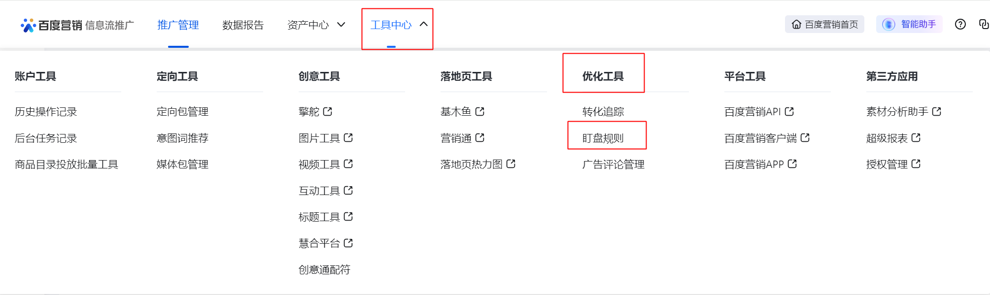 入口一:搜索和信息流推廣平臺→工具中心→優化工具→盯盤規則(原“自動規則”工具更名為“盯盤規則”,路徑不變)