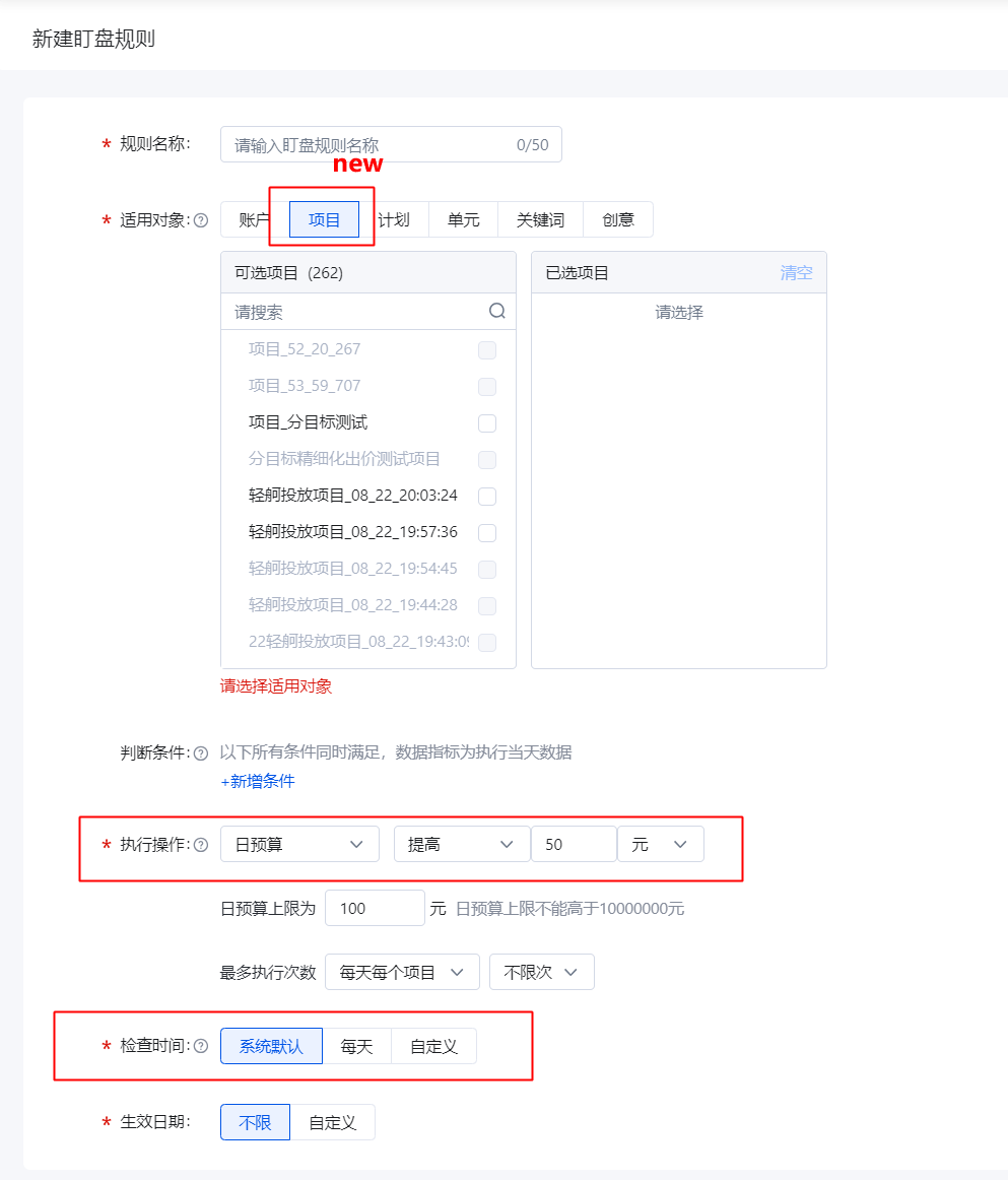 ② 盯盤規則支持對搜索項目層級(輕舸平臺創建和搜索平臺創建的項目均可支持),配置預算修改盯盤規則, 后續對項目層級會補充更豐富的規則類型。敬請保持關注~
