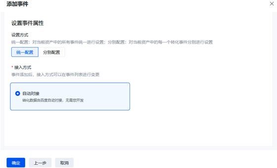 - 添加轉化事件,并設置事件屬性。投放百家號短劇時,由百度完成轉化數據的采集,接入方式為自動對接;