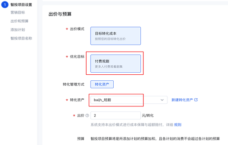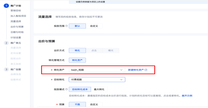 ① 轉化設置:新增【百家號】轉化資產,支持系統自動采集百家號短劇落地頁上發生的轉化數據,不需要客戶回傳