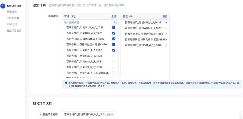 計劃層級常規投放和智投項目均支持【百家號推廣】營銷目標